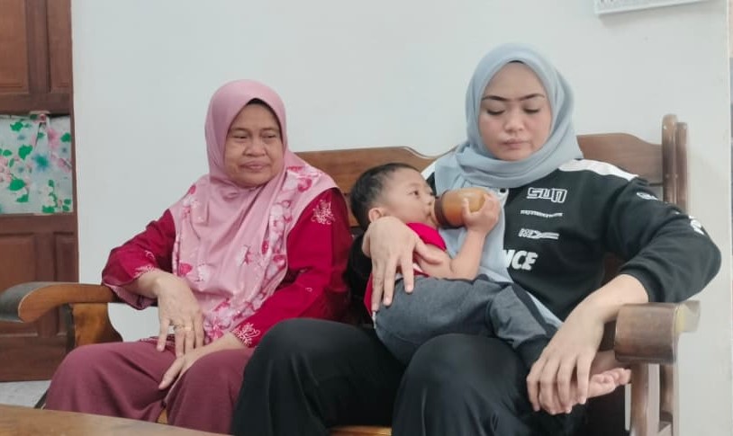 Siti Fatimah Sani (kanan) memeluk anaknya Muhammad Mikail Rafana Muhammad Rizal ketika ditemui di rumahnya di Parit Mentara Tiga, Bagan Serai, Perak.