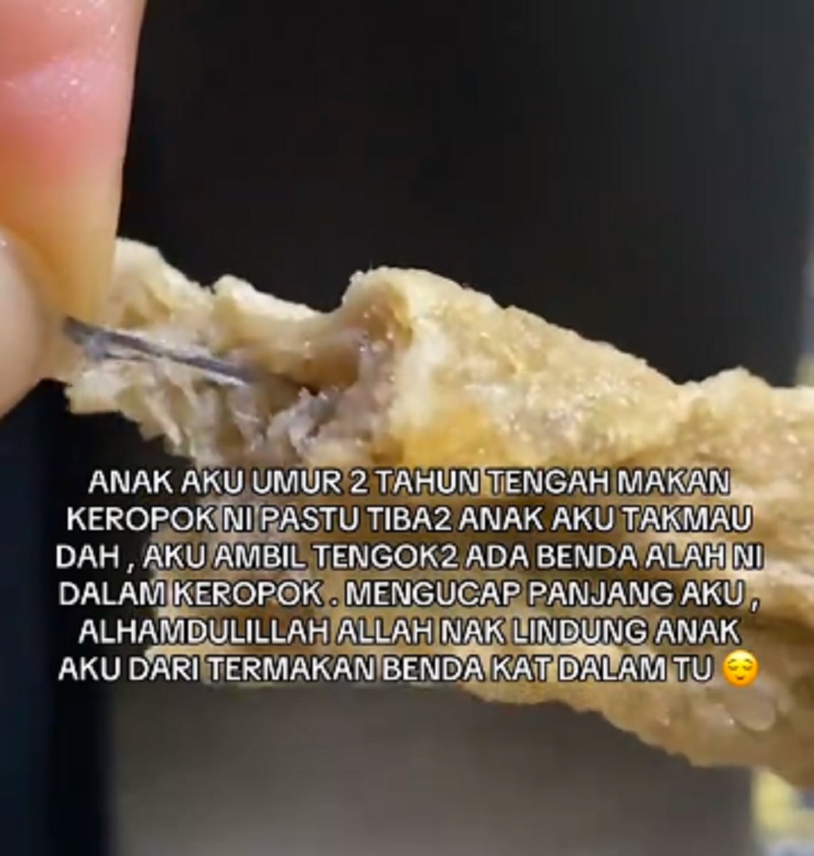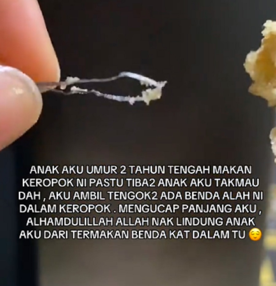 “Anak saya tengah makan keropok ni, tiba-tiba dia tak nak dah. Apabila saya tengok, ya Allah! Ada benda alah ni dalam keropok.