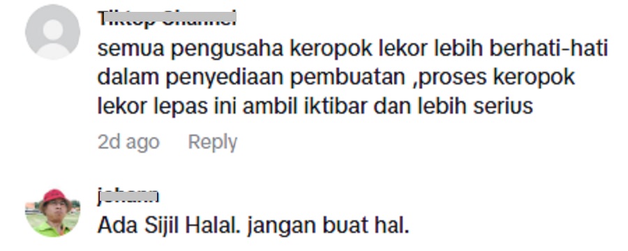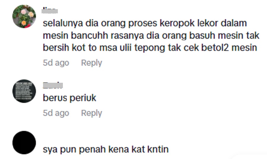 Beberapa pengguna turut memberi pendapat bahawa kejadian sebegini berkemungkinan berpunca daripada mesin pemprosesan atau pengadun tepung yang tidak dibersihkan dengan sempurna di kilang pembuatan keropok.