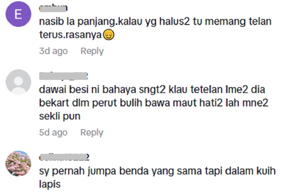 “Selalunya masa uli tepung tu, mesin bancuh tak dibersihkan betul-betul. Dawai gosok atau serpihan besi daripada mesin boleh tercampur dalam adunan,” tulis seorang netizen.