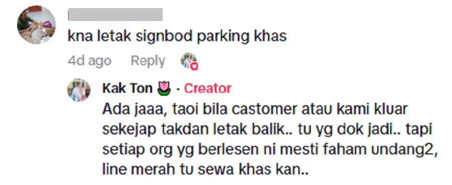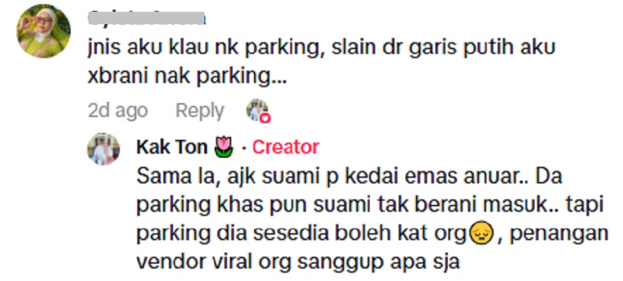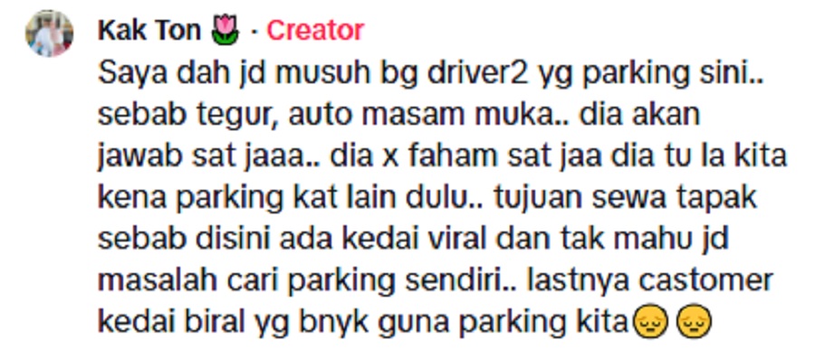 “Kami yang tak viral ni nak berniaga sekupang dua pula nak kena beralah bab parking,” jelasnya.
