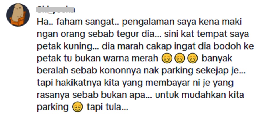 “Pengalaman saya kena maki sebab tegur orang. Dia marah, cakap ingat dia bodoh ke. Kat tempat saya petak kuning, tapi orang masuk juga sebab kononnya ‘sat jaa’. Kita yang bayar ni yang rasa terbeban,” ceritanya.