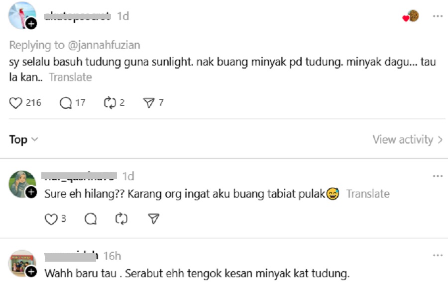 “Saya selalu basuh tudung guna Sunlight, nak buang minyak pada tudung, minyak dagu, tahulah kan,” seloroh netizen lain pula.
