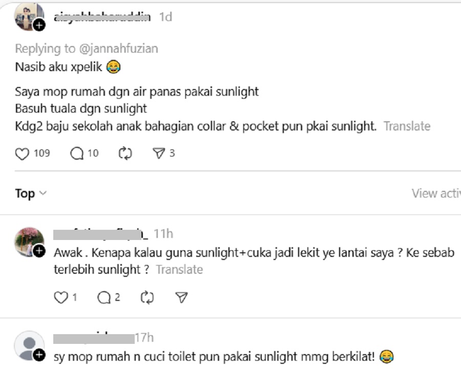 “Sama! Untuk baju putih. Hasilnya macam klorox tanpa rosakkan baju,” ujarnya, sebelum menutup dengan emoji senyum puas.