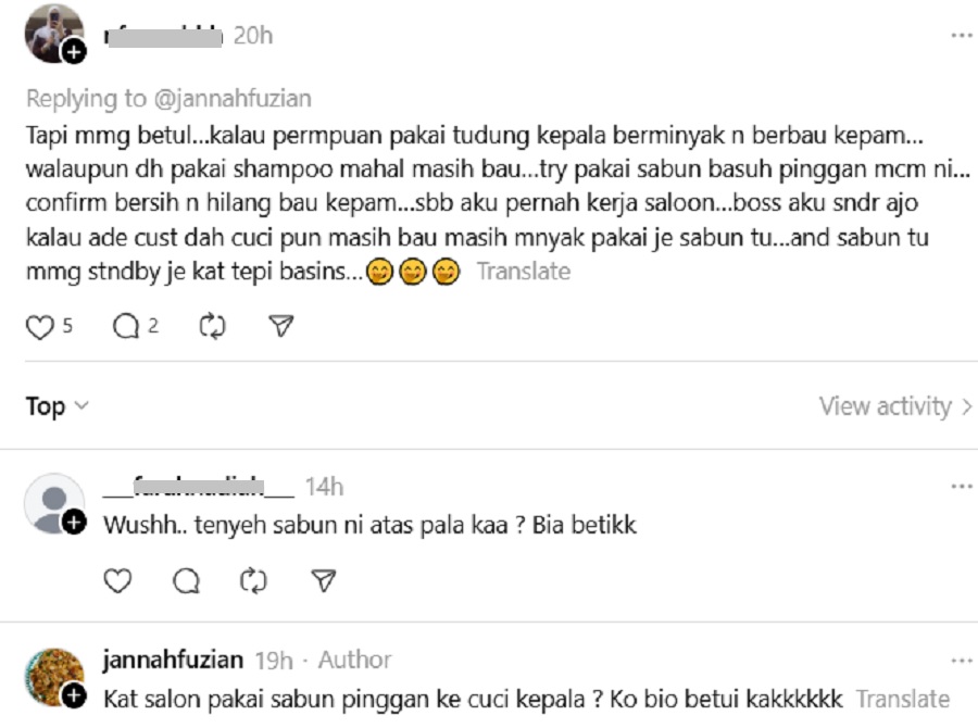 “Kalau perempuan pakai tudung kepala berminyak dan berbau kepam. Walaupun dah pakai syampu mahal masih bau. Cuba pakai sabun basuh pinggan macam ni, pasti bersih. Saya pernah kerja salun, bos saya sendiri ajar,” kongsinya.