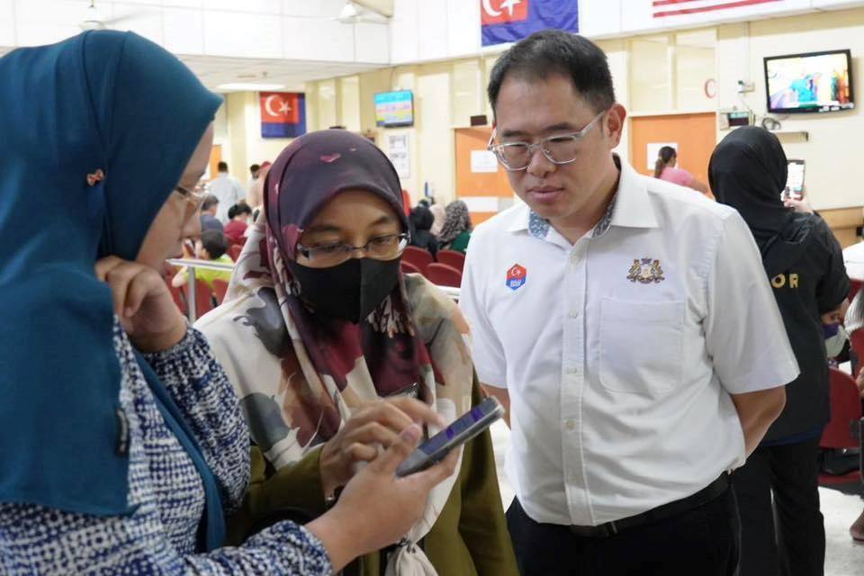 Ling Tian Soon melihat cara pelanggan membuat janji temu hospital melalui sistem SQS ketika membuat tinjauan ke Hospital Sultanah Aminah, Johor Bahru pada 16 Oktober 2025.