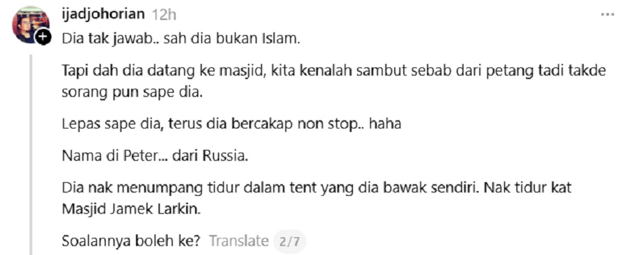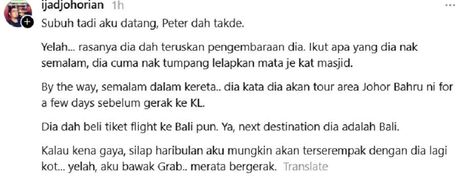 Kisah ini dikongsikan oleh pengguna media sosial @ijadjohorian pada 8 Disember 2025 lalu, yang terserempak dengan pelancong tersebut dikenali sebagai Peter ketika mahu menunaikan solat asar.