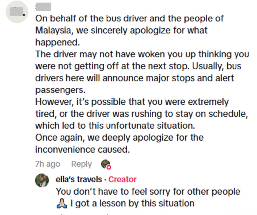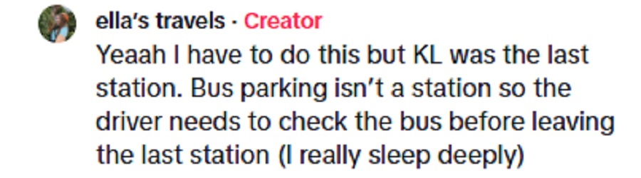 “Kuala Lumpur adalah hentian terakhir. Tapi bas berhenti di tempat parkir, bukan di stesen sebenar. Pemandu sepatutnya periksa dulu (bas) sebelum tinggalkan bas,” jelasnya dalam ruang komen.