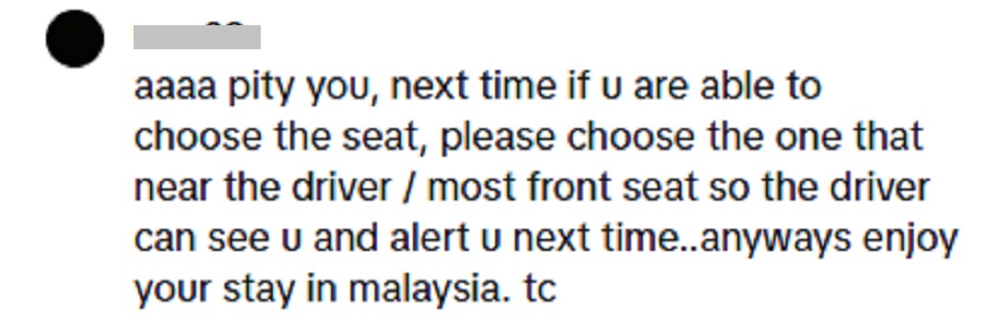 “Kalau boleh, pilih tempat duduk depan atau berdekatan pemandu. Jadi dia boleh nampak dan sedarkan awak nanti. Apa pun, selamat menikmati masa di Malaysia,” tulisnya.