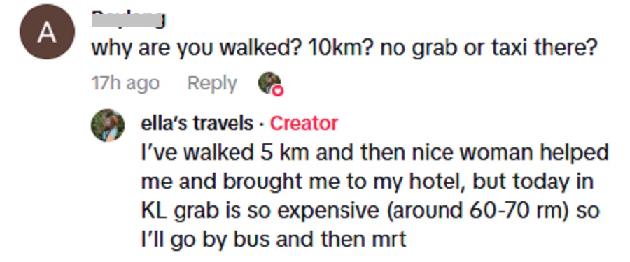 “Saya dah jalan 5 km sebelum seorang wanita baik hati bantu saya dan hantar ke hotel. Tapi hari ini di Kuala Lumpur, tambang Grab sangat mahal, sekitar RM60 hingga RM70. Jadi saya ambil keputusan naik bas dan MRT saja,” katanya.