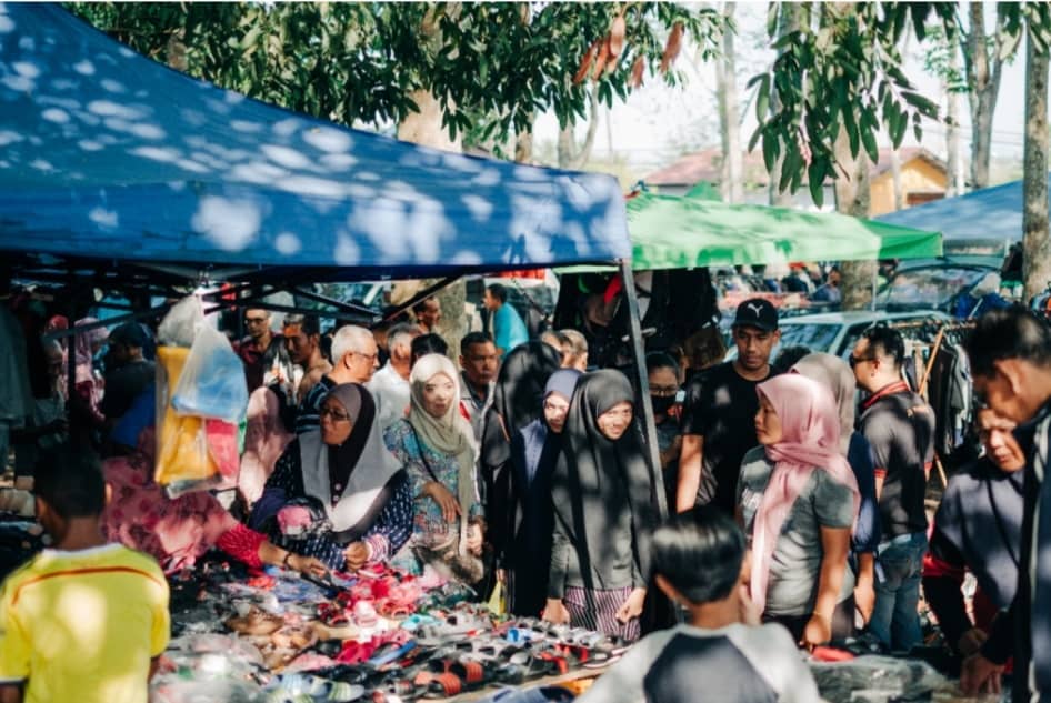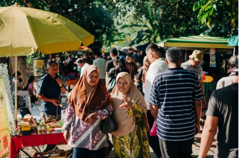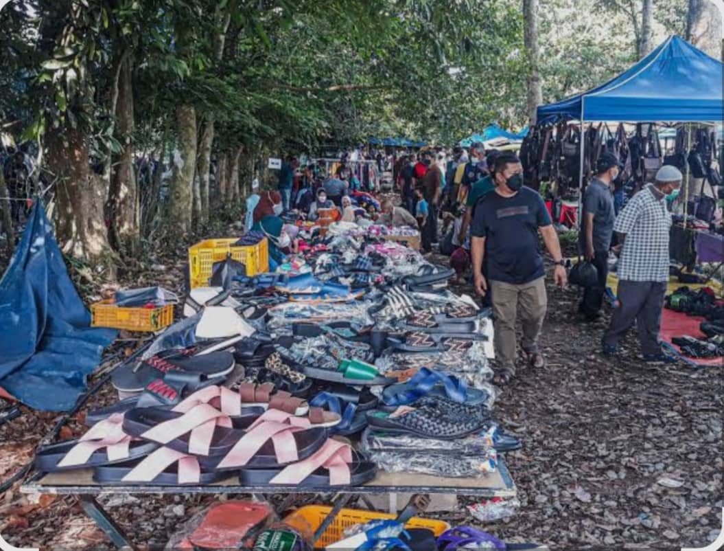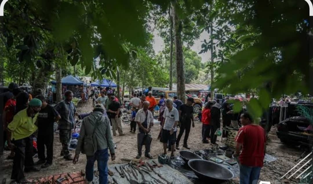 Orang ramai berpusu memenuhi 'Nat Pokok Getah', pasar pagi dalam kebun getah di Arau, Perlis.