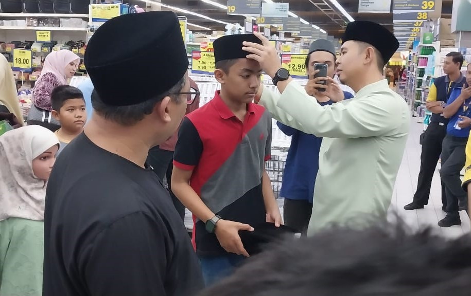 Muhammad Nakhaei Abdul Wahab (kanan) sedang memakai songkok kepada seorang anak yatim di Mydin Parit Buntar, Perak.