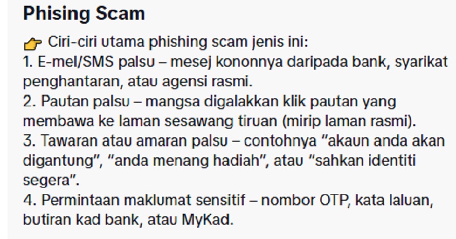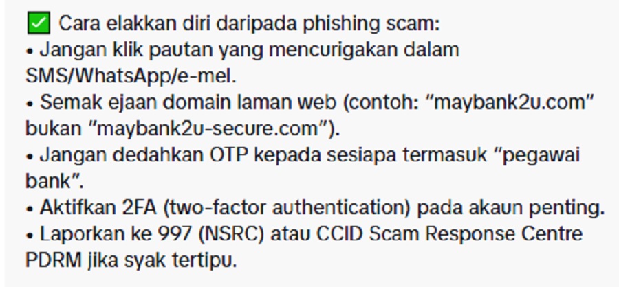 Orang ramai juga disarankan mengaktifkan two-factor authentication (2FA) pada akaun penting dan segera melaporkan ke 997 - Pusat Respons Scam Kebangsaan (NSRC) - sekiranya menjadi mangsa.
