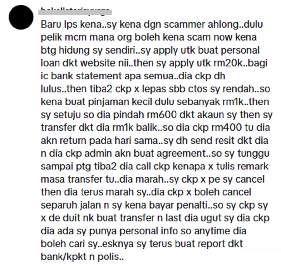 "Dia minta buat pinjaman kecil RM1,000 dulu, tapi lepas transfer terus ugut sebab ada IC dan dokumen bank saya.”