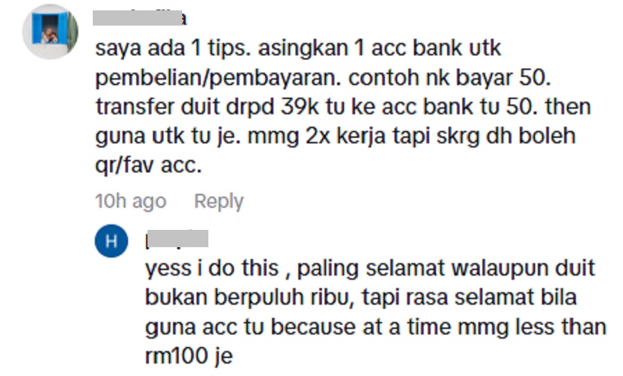 Ada juga netizen berkongsi tip supaya berhati-hati. “Asingkan satu akaun khas untuk transaksi online. Masukkan duit hanya apabila nak bayar. Memang nampak leceh tapi lebih selamat.”