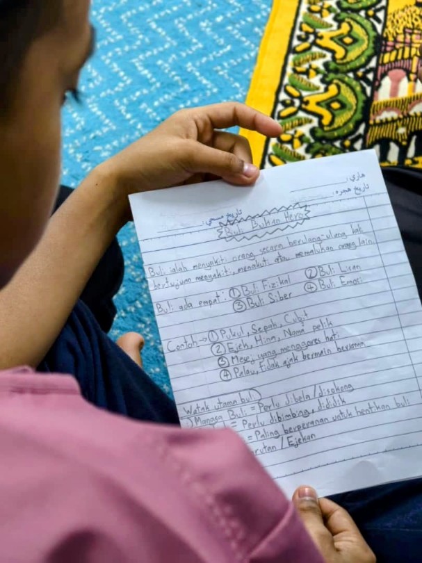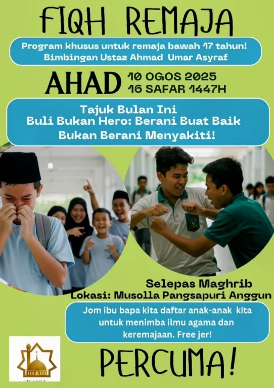 Mutakhir, fenomena buli di sekolah amat membimbangkan dan memerlukan perhatian serius semua pihak. Bagi menyatakan keprihatinan isu buli di sekolah, Musolla Pangsapuri Anggun, Seksyen 4, Bandar Baru Bangi, Selangor menganjurkan program Fiqh Remaja bertajuk, Buli Bukan Hero: Buat Baik Bukan Berani Menyakiti. - KitaReporters