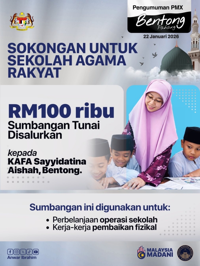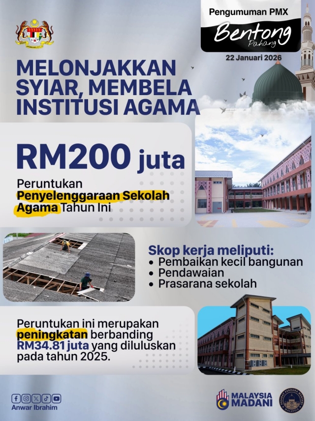 "Ini termasuk bagi menyokong maahad tahfiz, sekolah agama rakyat dan institusi pondok yang harus kekal menjadi benteng pembinaan sahsiah dan kefahaman ummah," tegas Perdana Menteri, Datuk Seri Anwar Ibrahim.