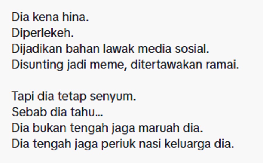 “Dia kena hina, diperlekeh, dijadikan bahan lawak media sosial, disunting jadi meme dan ditertawakan ramai. Tapi dia tetap senyum, sebab dia tahu dia bukan tengah jaga maruah dia, dia tengah jaga periuk nasi keluarga dia.