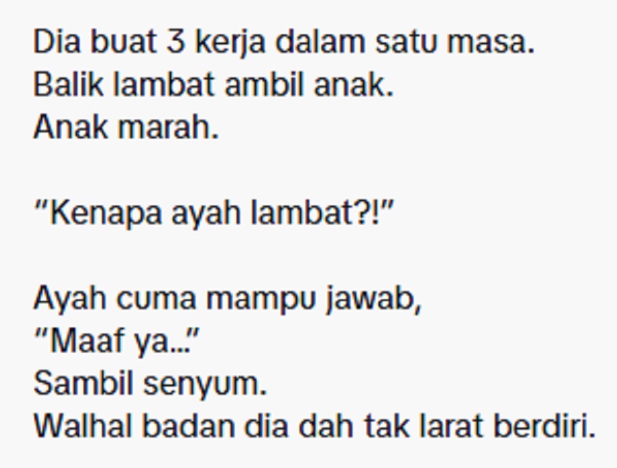 ambil anak. Anak marah. “Kenapa ayah lambat?” Ayah cuma mampu jawab, “Maaf ya,”