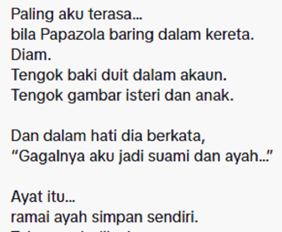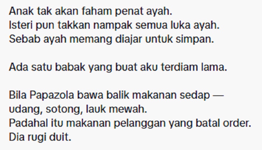 “Tapi ayah tetap bangun esok pagi. Pakai senyum. Pakai lawak. Apabila ditanya kenapa tak makan, jawapannya tetap sama, “Ayah dah makan kat luar.” Walhal perutnya kosong, supaya anak-anaknya kenyang,” tulisnya.