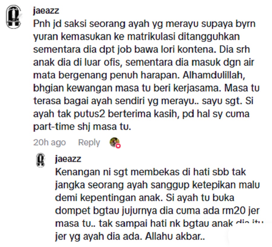 menceritakan pengalamannya melihat seorang ayah merayu agar yuran kemasukan matrikulasi
