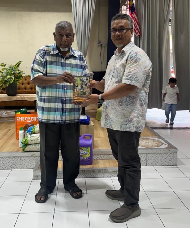 Abd Malik (tengah) melakukan gimik penyerahan sumbangan barangan asas keperluan harian kepada Azman Rasman pada program lawatan 5 Oktober 2025.