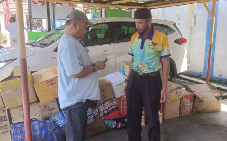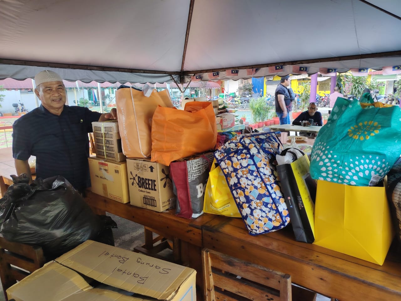 Nasiruddin Keling bersama pakaian terpakai dan barangan asas keperluan harian sumbangan pelbagai NGO dan individu prihatin untuk dihantar ke Pos Balar.