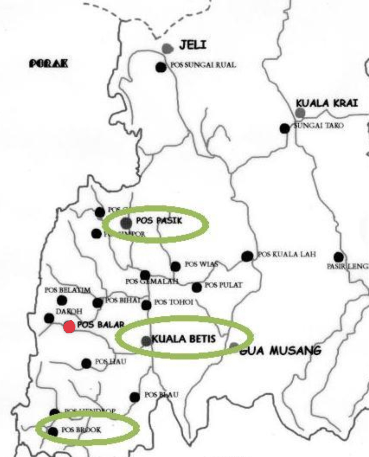 Bertanda merah merupakan lokasi Kampung Orang Asli Temiar di Pos Balar, Gua Musang, Kelantan.