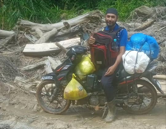 Hasmadi Ghazali terpaksa menunggang motosikal untuk menghantar sumbangan orang ramai ke Pos Balar kerana jalan tanah yang berlumpur.