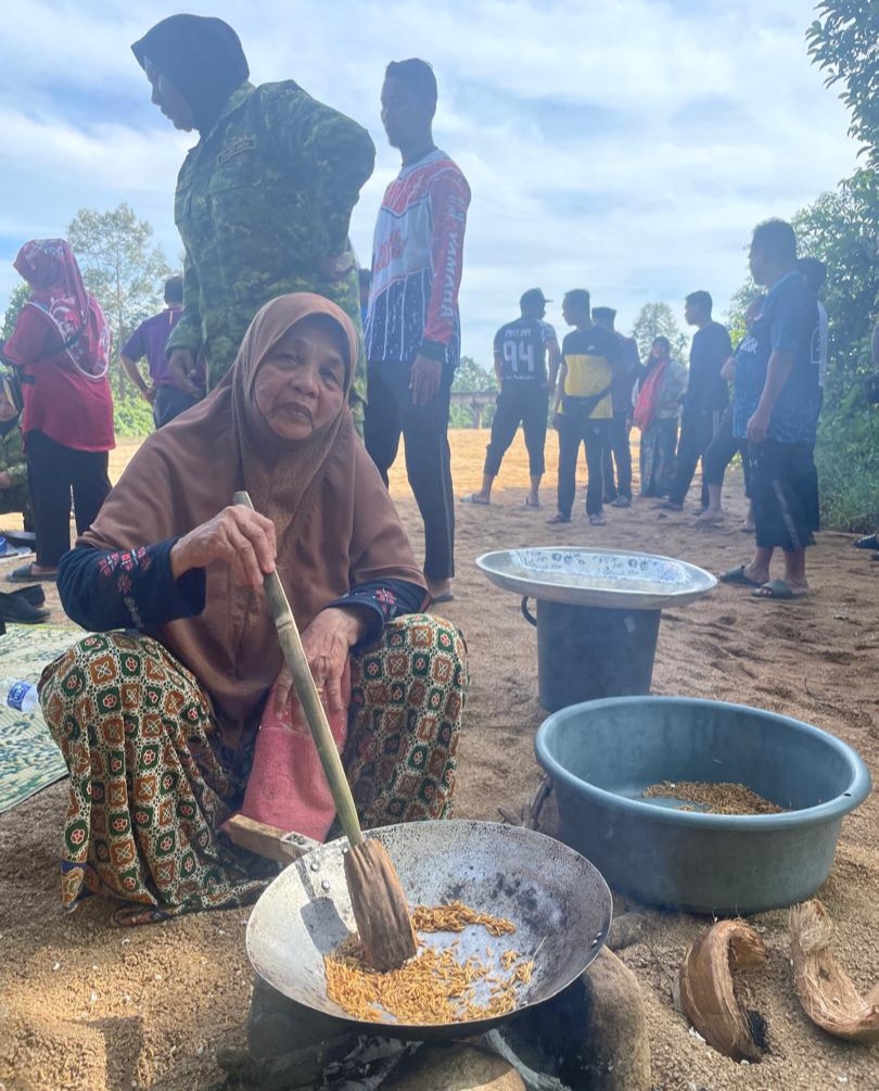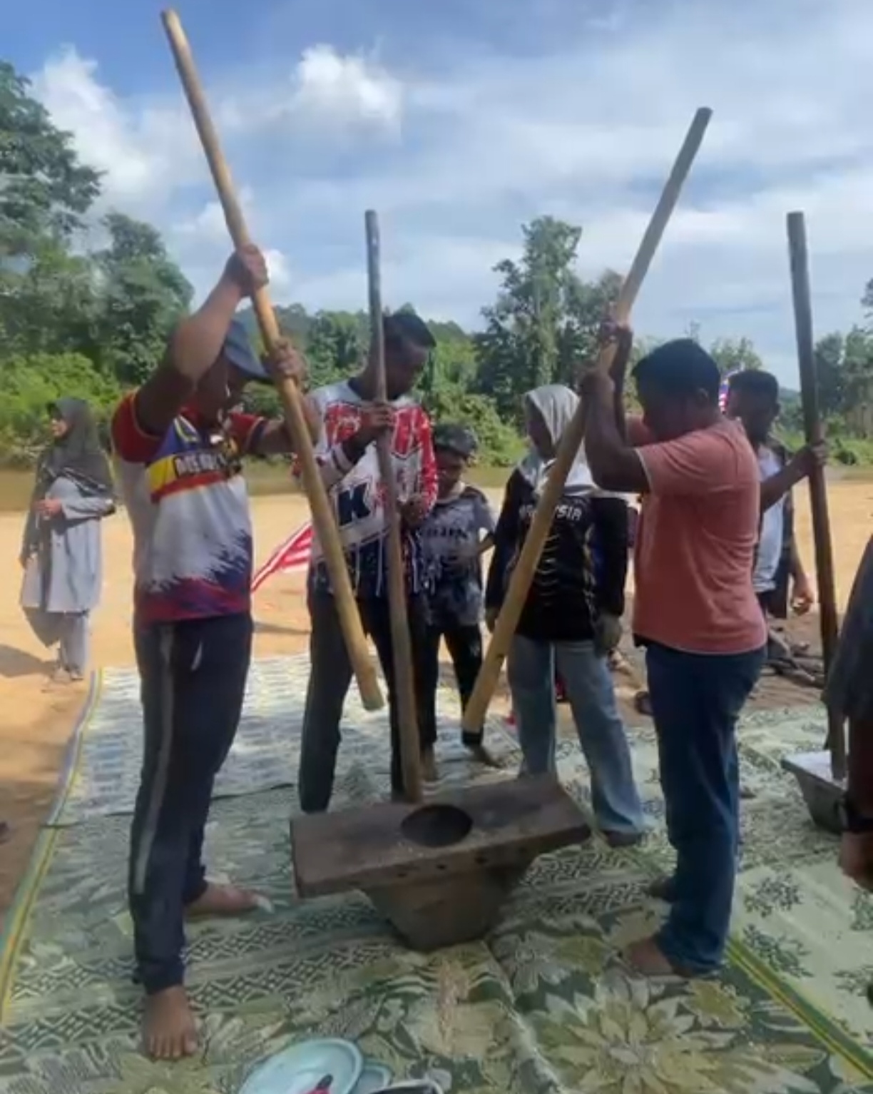 Penduduk kampung bergotong-royong menumbuk padi muda yang masih panas selepas digoreng dalam lesung kayu.