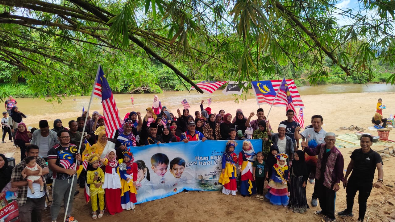 Penduduk Kampung Sekayu merakamkan kenangan bersama tetamu jemputan selepas selesai aktiviti mengemping bersempena program Sambutan Hari Kemerdekaan Negara ke-68 di Pengkalan Buluh Aur, Tepi Sungai Berang.