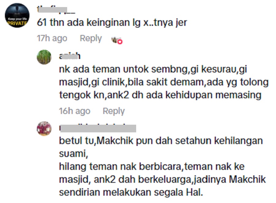 Namun di sebalik gurauan, ramai netizen memahami bahawa kehidupan warga emas bukan sekadar soal usia, tetapi juga tentang kesepian dan rasa ingin ditemani.