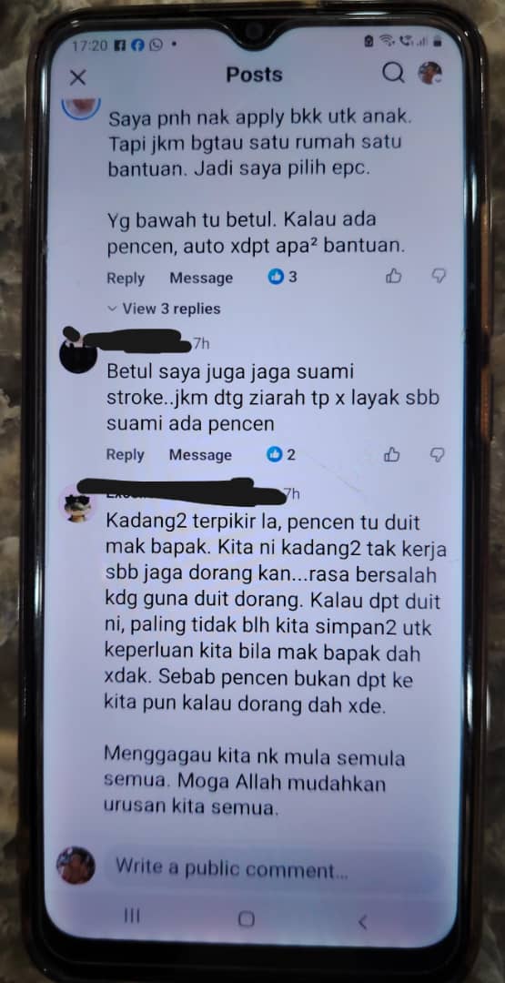 “Kalau pesakit yang dijaga sudah menerima bantuan JKM, penjaga tidak lagi layak. Pesakit yang ada pencen juga tak layak, Kalau pesakit dah dapat bantuan JKM, penjaga tak layak.”