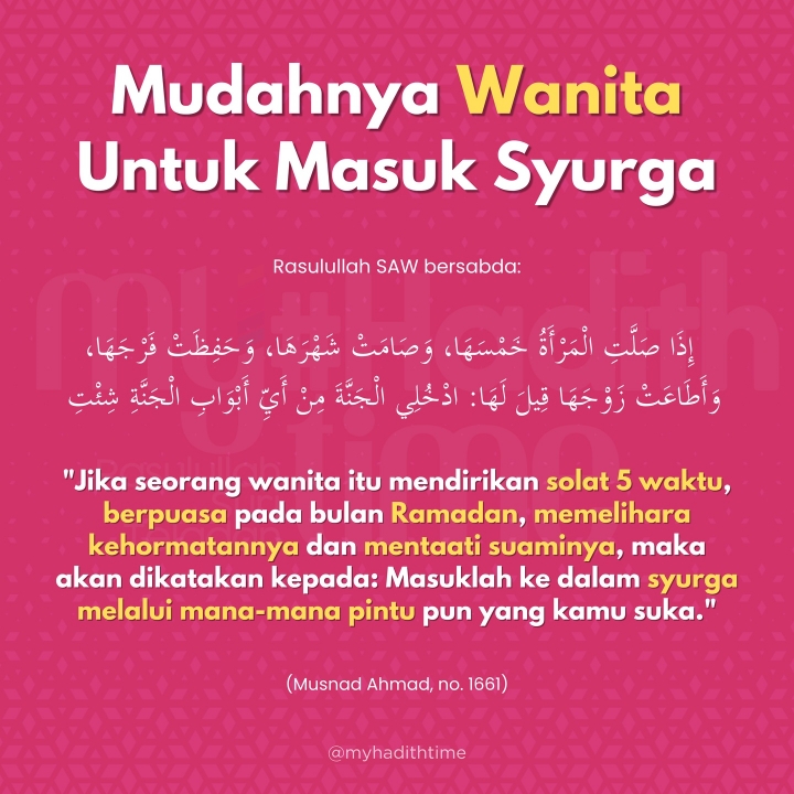 Diriwayatkan daripada Abu Hurairah R.A, bahawa Rasulullah SAW bersabda: Maksudnya: “Jika wanita mengerjakan solat lima waktu, berpuasa pada bulan Ramadhan, memelihara kemaluannya, mentaati suaminya, maka dikatakan kepadanya (pada hari Kiamat): ‘Masuklah ke dalam syurga dari pintu mana pun yang kamu mahu.”