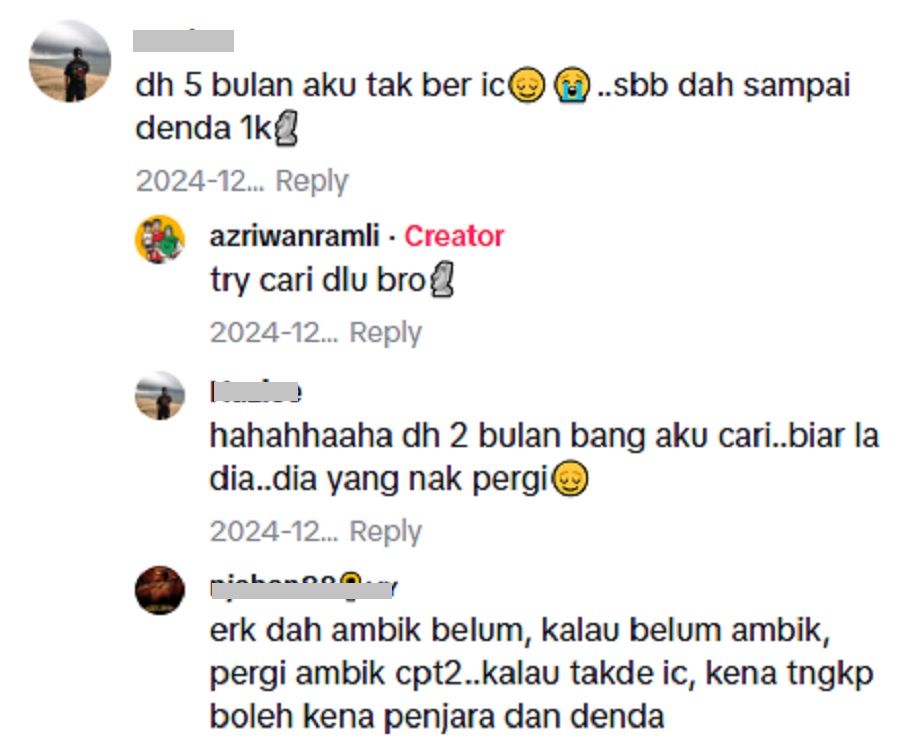 Lebih mengejutkan ada netizen yang berkongsi cerita bahawa dirinya sudah lima bulan tidak mempunyai kad pengenalan kerana tidak mampu membayar denda RM1,000 untuk permohanan kali ketiga. Semoga saudara ini diberikan rezeki untuk membuat kad pengenalan baharu.