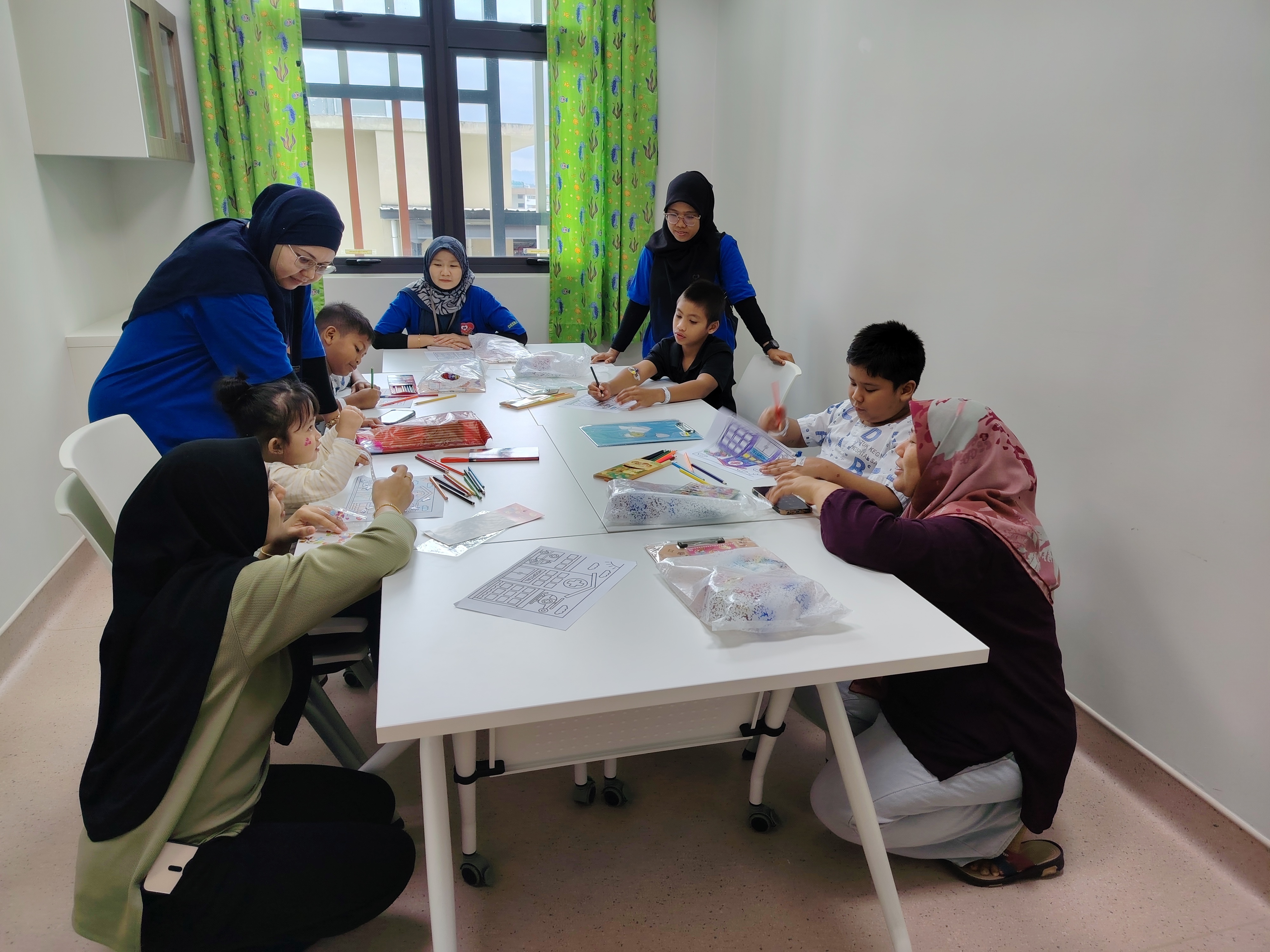 Sebahagian ibu dan ahli kelab sukarelawan membimbing kanak-kanak yang menyertai pertandingan mewarna.