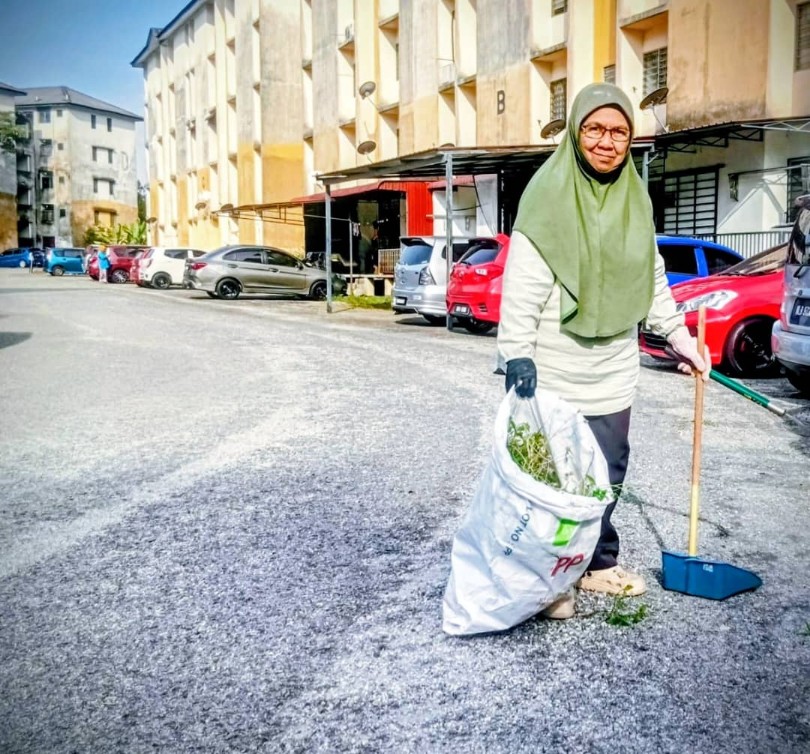 Status warga emas tidak menghalang wanita ini untuk mengambil bahagian bagi membersihkan Kawasan kediamannya.