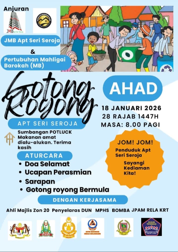 SEMANGAT kebersamaan dan tanggungjawab komuniti jelas terpancar menerusi "Program Gotong-Royong Perdana" anjuran Jawatankuasa Pengurusan Bersama (JMB) Apartmen Seri Seroja dengan kerjasama Apartmen Mahligai Barokah di Pekarangan Blok C, Bukit Beruntung, Selangor pada 18 Januari 2026.