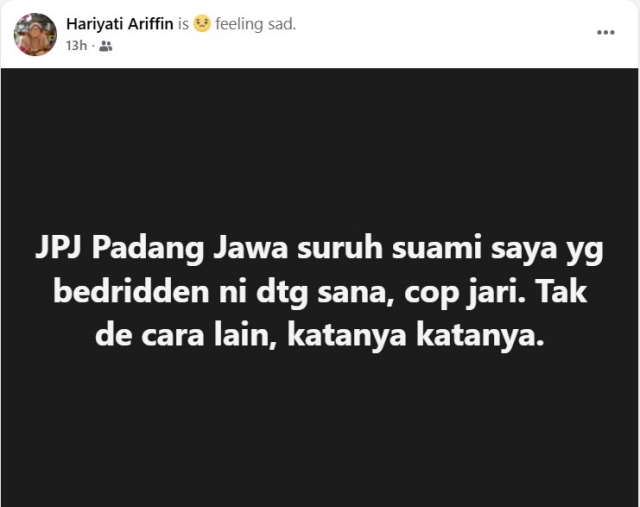Saya cuba luahkan hal ini dalam media sosial Facebook dan bertanya siapa ada kenalan di JPJ untuk saya minta bantuan.