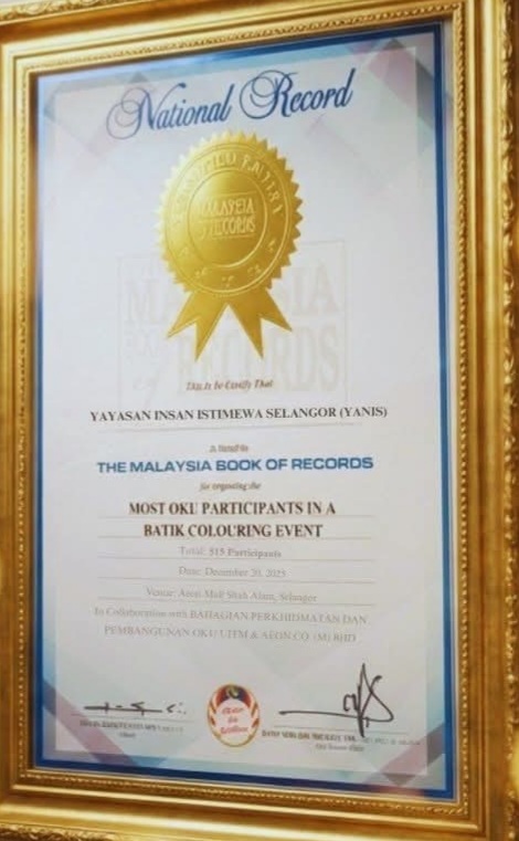 Siapa sangka seramai 515 peserta orang kurang upaya (OKU) telah berhimpun dalam satu acara mewarna batik dan berjaya melakar sejarah apabila tercatat dalam Malaysia Book of Records (MBOR) sebagai penyertaan OKU teramai dalam mewarna batik pada 20 Disember 2025.