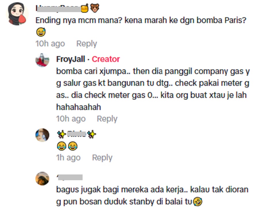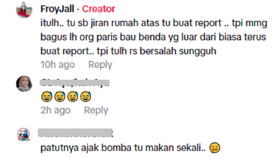 âItulah, jiran rumah atas buat report. Tapi bagus juga sebenarnya orang Paris ni, apabila bau benda pelik, terus ambil tindakan. Cuma masa tu rasa bersalah sungguh,â jelasnya dalam ruangan komen.
