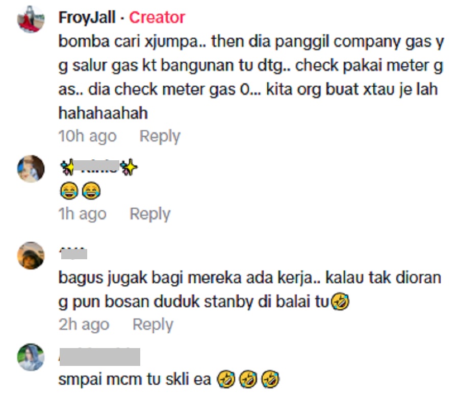 âBomba cari tak jumpa. Lepas tu dia panggil syarikat gas yang salur gas di bangunan tu datang. Check pakai meter gas, bacaan 0. Kita orang buat tak tahu je lah,â kongsi Faroy sambil ketawa.