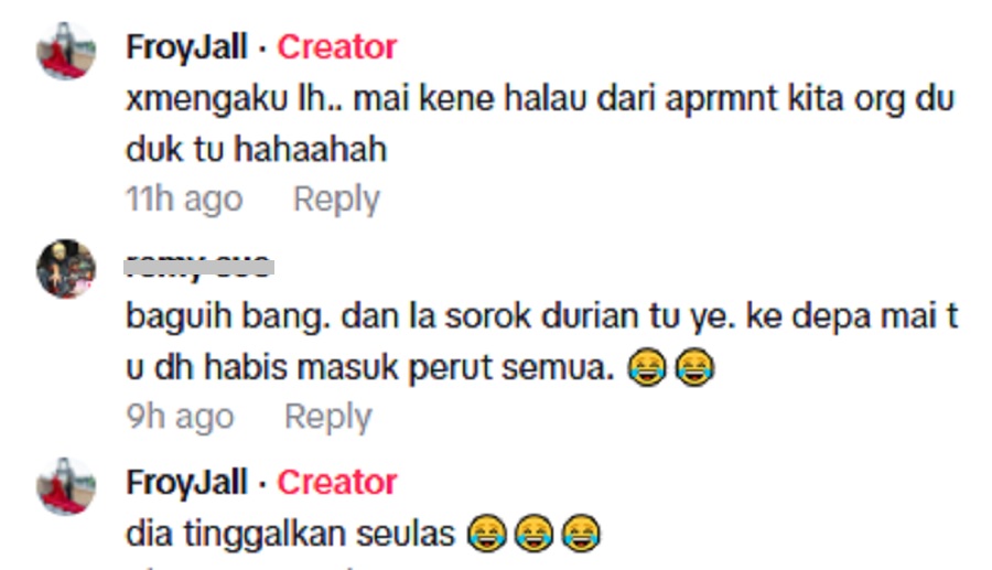 âSungguh weh durian ni bau macam gas. Aku pun pernah beli durian, lepas tu lupa. Tiba-tiba bau gas, terus berlari ke dapur nak cari punca, rupa-rupanya durian!â cerita seorang netizen.