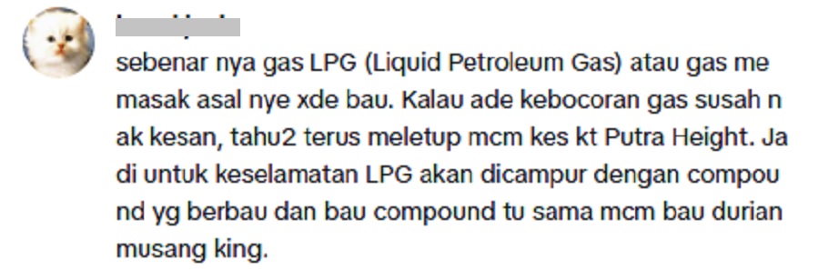 âSebenarnya gas LPG asalnya tak ada bau. Kalau berlaku kebocoran, memang susah nak kesan. Jadi, untuk keselamatan, gas akan dicampur dengan bahan berbau kuat dan bau compound tu memang sama macam bau durian Musang King,â jelasnya.