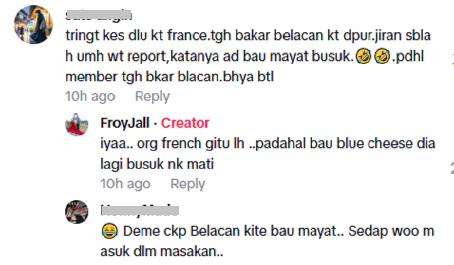 âIya lah. Orang Perancis ni begitulah. Padahal bau blue cheese dia lagi busuk nak mati,â tulisnya sambil bergurau.