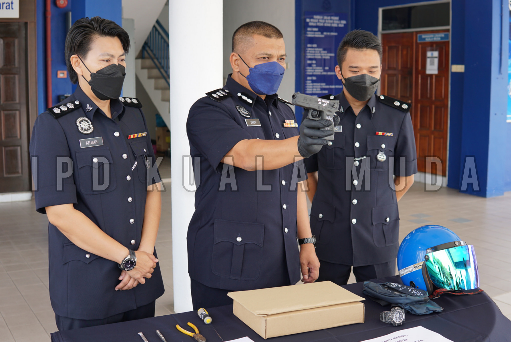 Ketua Polis Daerah Kuala Muda, Asisten Komisioner (ACP) Zaidy Che Hassan (tengah) menunjukkan pistol tiruan yang digunakan oleh suspek dalam kejadian samun bersenjata di sebuah kedai serbaneka 7 Eleven di Taman Setia Budi, Tikam Batu, Sungai Petani, Kedah. - Kredit foto: FB PDRM (IPD Kuala Muda).