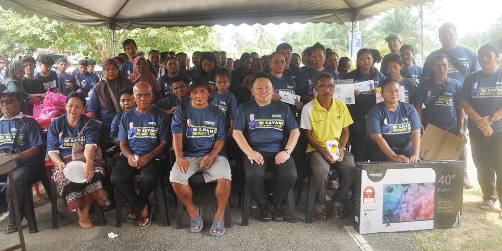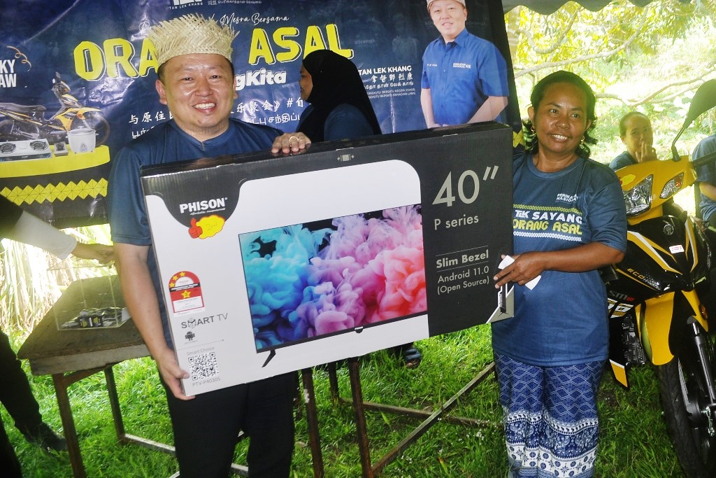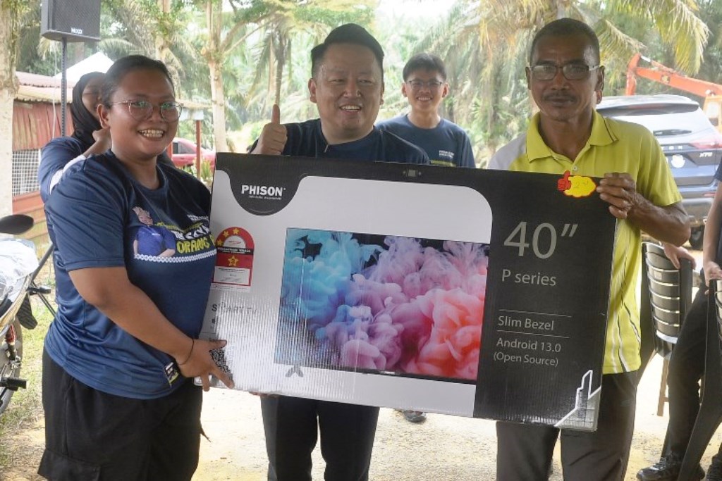 Datuk Tan Lek Khang menyampaikan televisyen kepada pemenang cabutan bertuah di Kampung Sri Tempayan, Bekok.