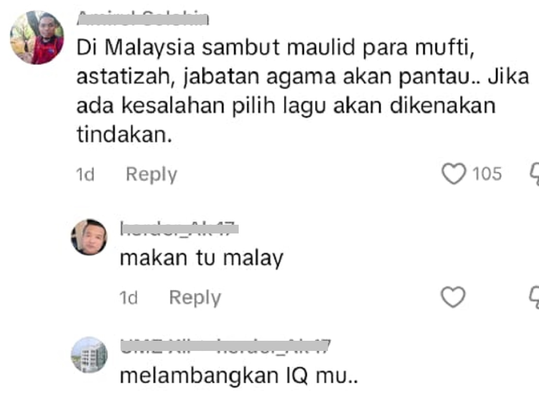 "Sambutan maulud di Malaysia, para mufti, astatizah dan jabatan agama akan pantau. Jika ada kesalahan pilih lagu akan dikenakan tindakan," tulisnya.