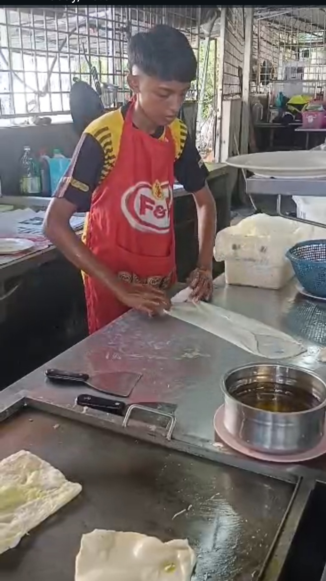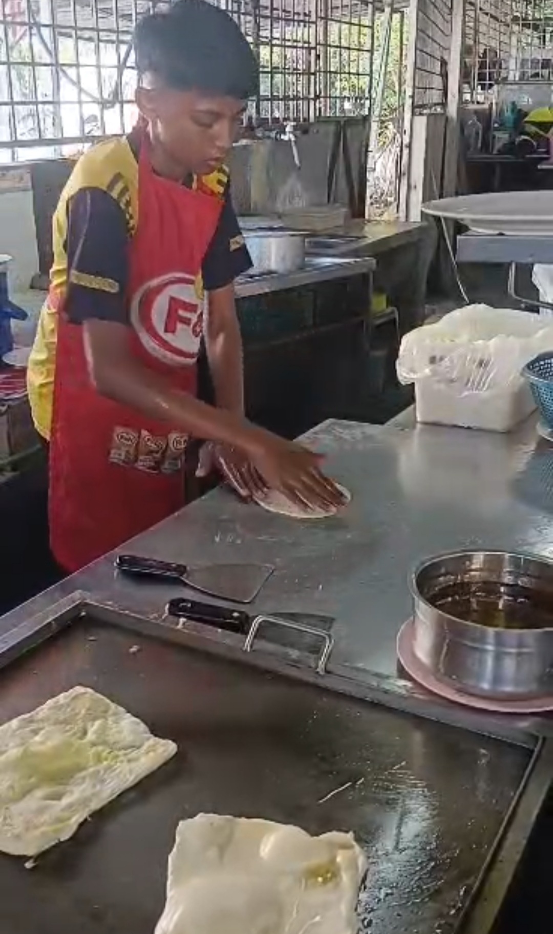 "Saya mula belajar buat roti canai semasa cuti sekolah tahun lepas (2024). Walapun kuali dan dapur pasa tapi ia tidak jadi penghalang.