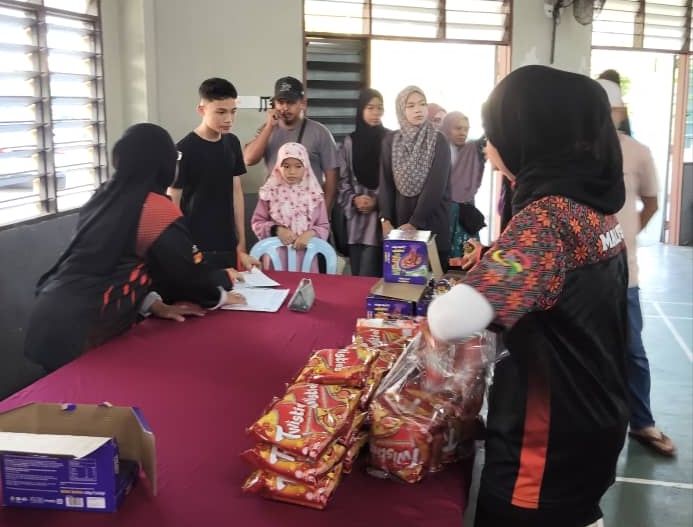 Ahli Jawatankuasa Wanita PPIE3 membantu mengagihkan barangan kepada murid sekolah rendah.